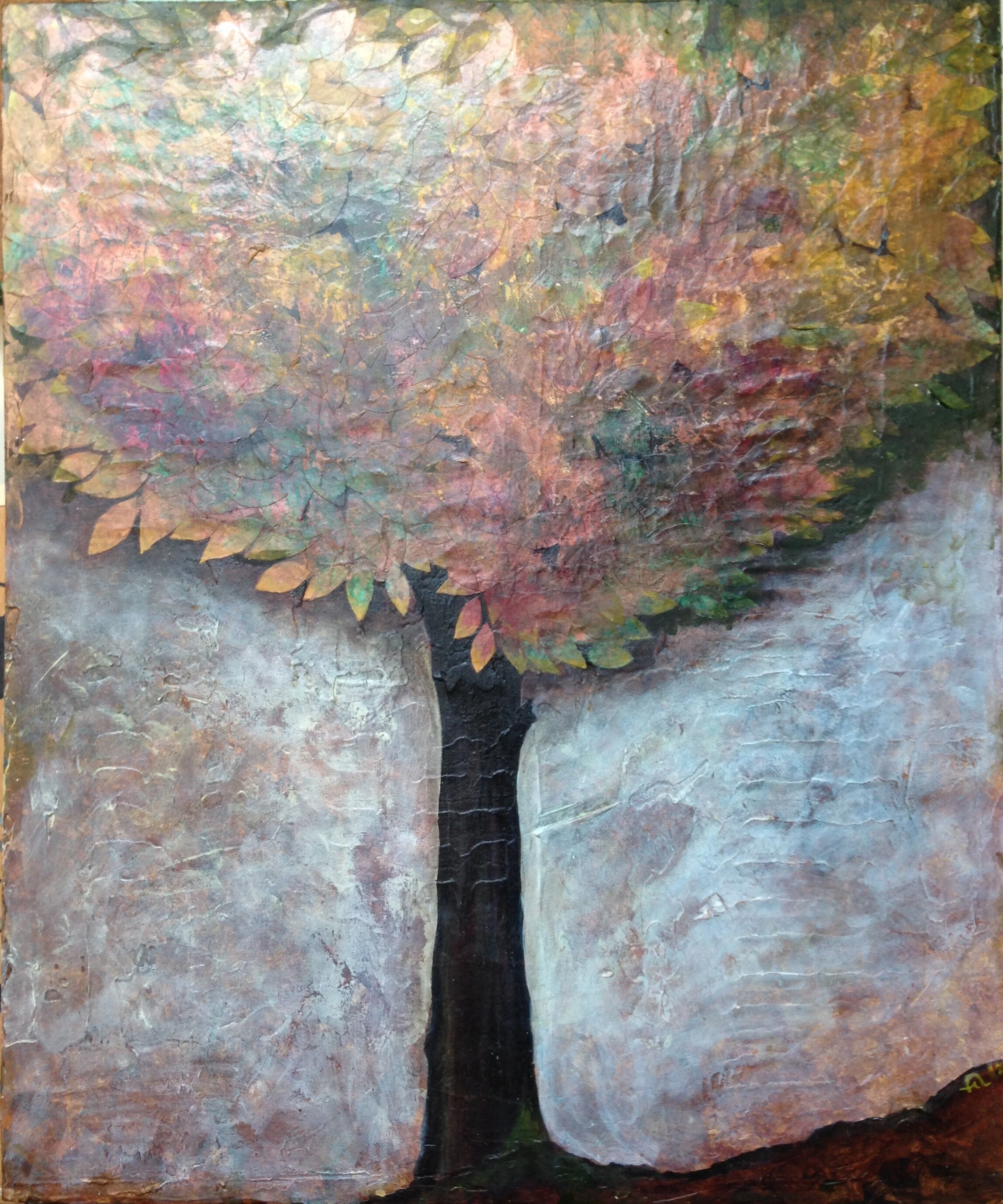 Mix media fiber, paper & wood this piece is a collection of various fibers and paper sewn together